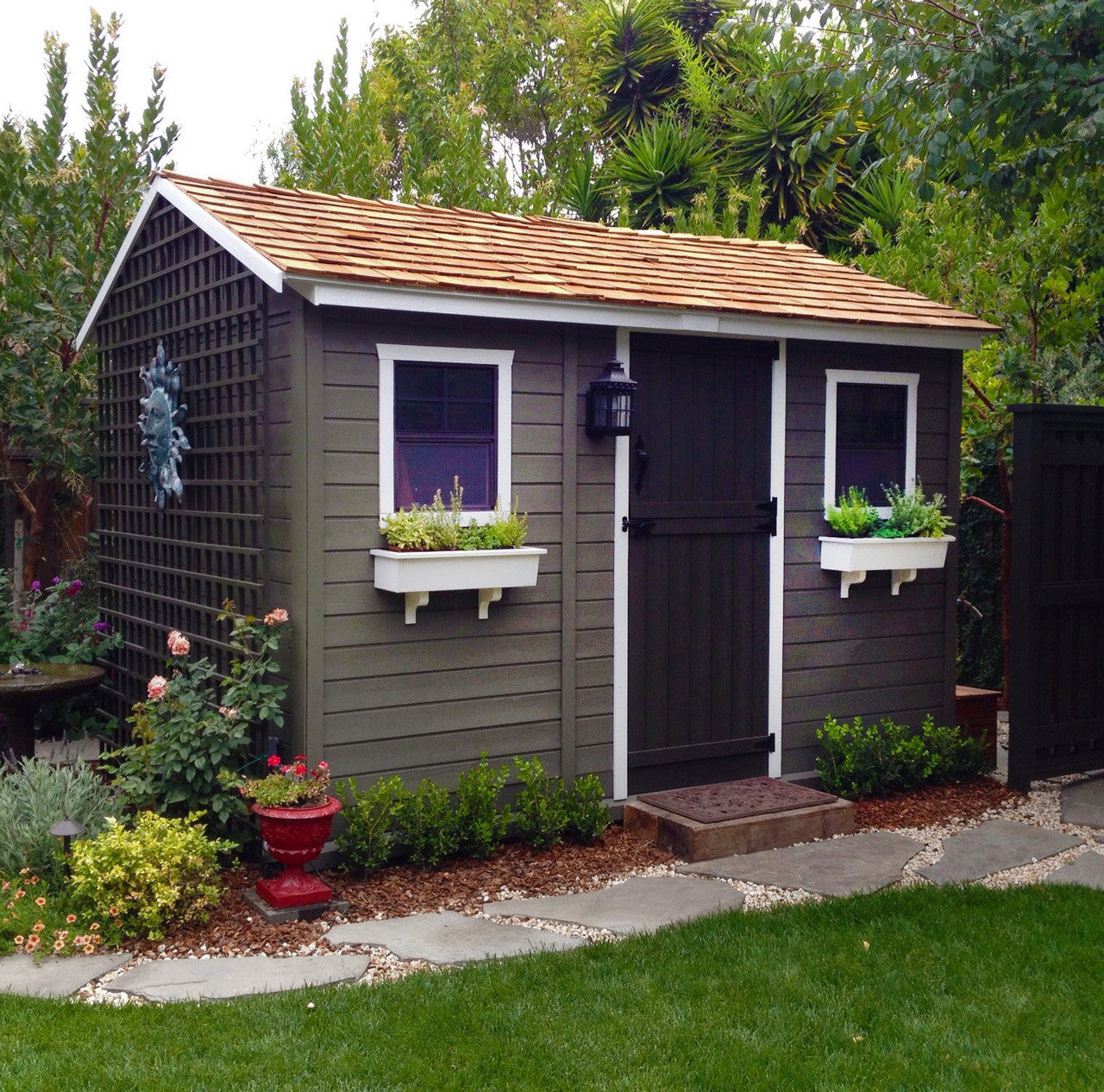 This cedar garden shed naturally weathers to a light grey color. We recommend staining or painting the shed. Western red cedar wood accepts a wide range of finishes to help you customize the appearance of shed. Unlike pressure treated lumber, there are no toxic chemical preservatives used in its manufacturing.