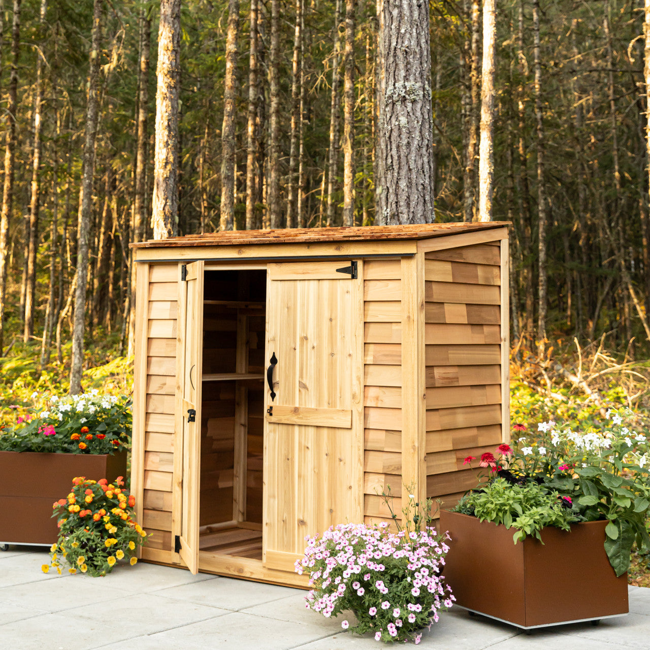 Made from durable, rot-resistant cedar, this 6' x 3' garden shed is an outdoor storage solution for storing garden tools, sporting equipment, evan a garbage can or two.