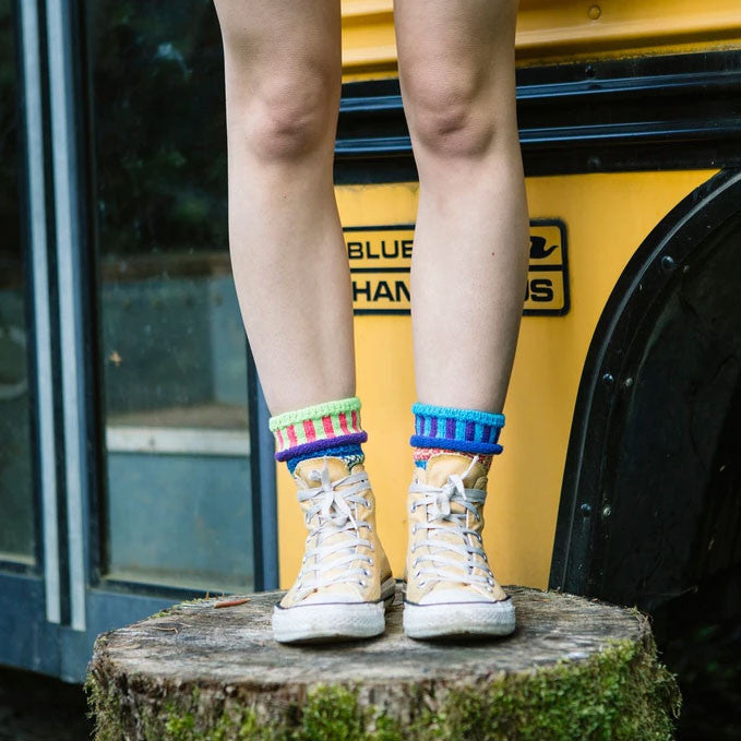 Bluebell Recycled Cotton Socks are inspired by the little blue flowers that dot the garden in spring. Colors in the Bluebell socks: lime green, turquoise, purple, royal blue, and fuchsia.