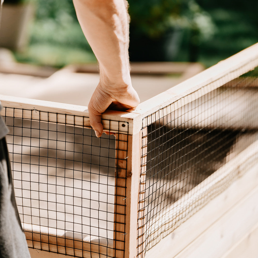 All of our fencing sections are backed with 3/4" wire mesh. When the fencing is delivered, the mesh is already affixed. So, it takes only minutes to attach the fencing sections to the garden beds. Up close, it looks attractive, but from a distance you can't even see it.