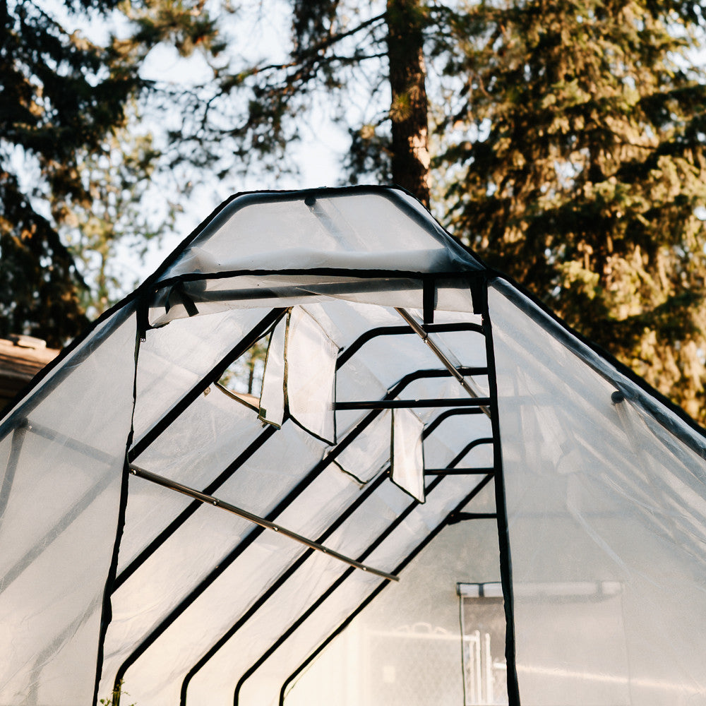 The greenhouse cover helps you start your garden early and protects your plants from frost. You can easily take off the greenhouse cover and framing in minutes. When the greenhouse frame and cover are installed, you can access the inside through a 30-inch wide by 78-inch tall doorway with closing zipper.