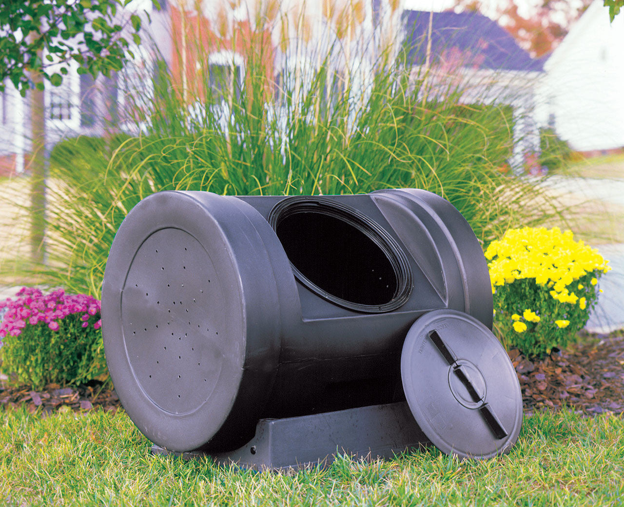 The low profile ensures that it stays out of sight and won't be blown over in high winds. The polyethylene resin material used to mold the drum is 100% recycled and the rich dark color absorbs the sun's heat, keeping your compost at a nice hot temperature.
