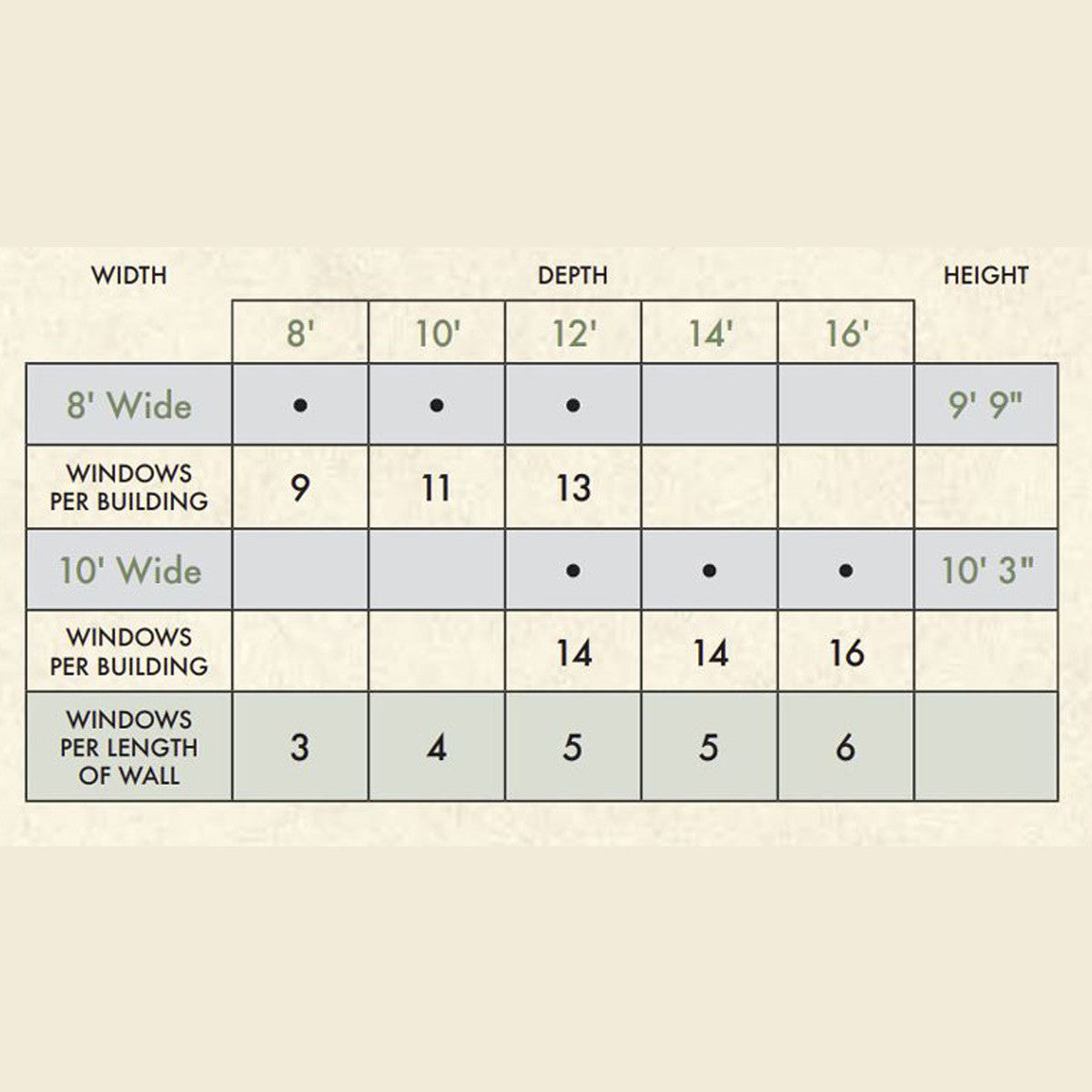 - 18"x47" single-pane windows, quantity varies by size of greenhouse