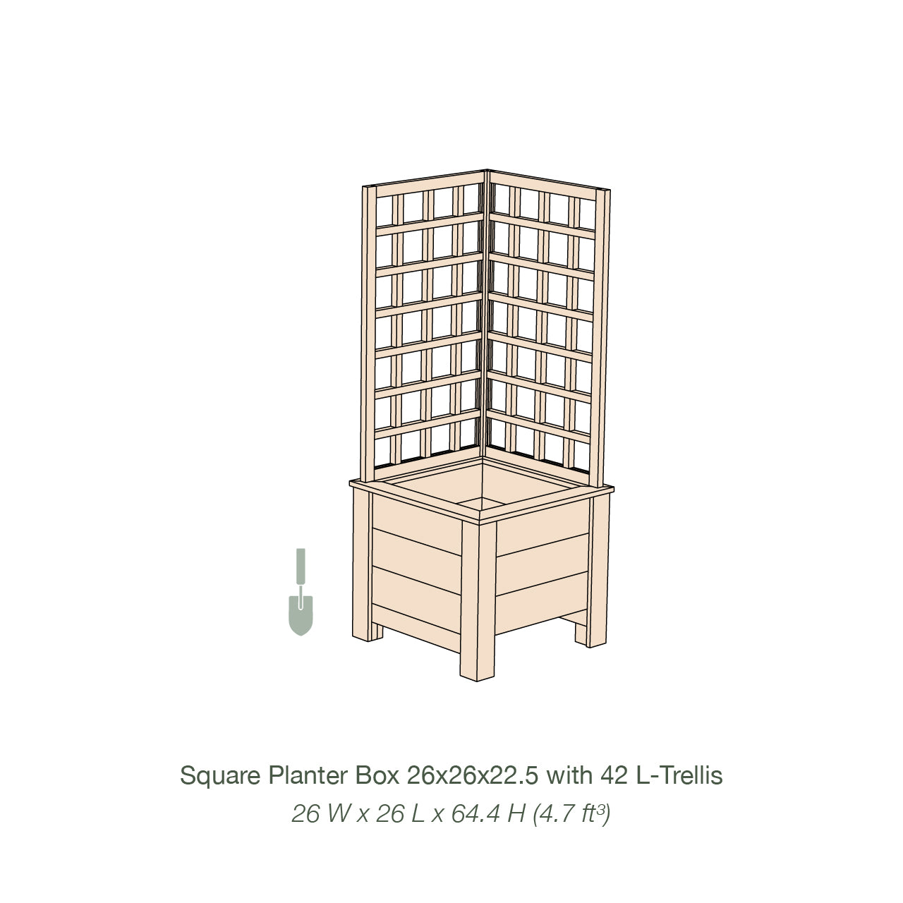 The L-shaped trellis and square planter is great for placing nearby entrances or on the corner of a patio or deck to enclose the space. The trellis structure and climbing plants provide an attractive focal point or backdrop, enhancing your outdoor area. Choose your planter size - either 20" x 20" or 26" x 26" - to suit your space and needs, along with the overall planter depth and trellis height.