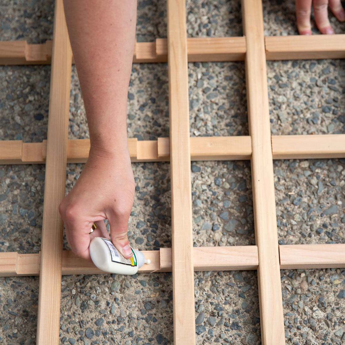 For the trellis portion, assembly involves arranging the vertical and horizontal trellis cross pieces on a flat surface, then gluing the notches and applying pressure to form a grid. Once the cross pieces are in place, the frame can be attached with included screws, again applying wood glue to the notches where the cross pieces join the frame. The final steps involve attaching the trellis panels to the planter box.