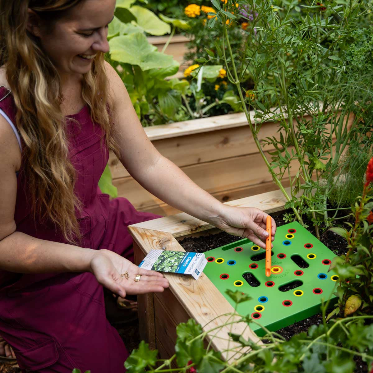 Inspired by the popular gardening method of Square Foot Gardening, the Seeding Square offers a simple template for over 40 types of vegetables. Seeds are sown in specific positions within a square foot, allowing enough room for each plant to grow to maturity without wasting space. Simply press the Seeding Square into the soil and use the guide of the color-coded holes to plant your seeds!