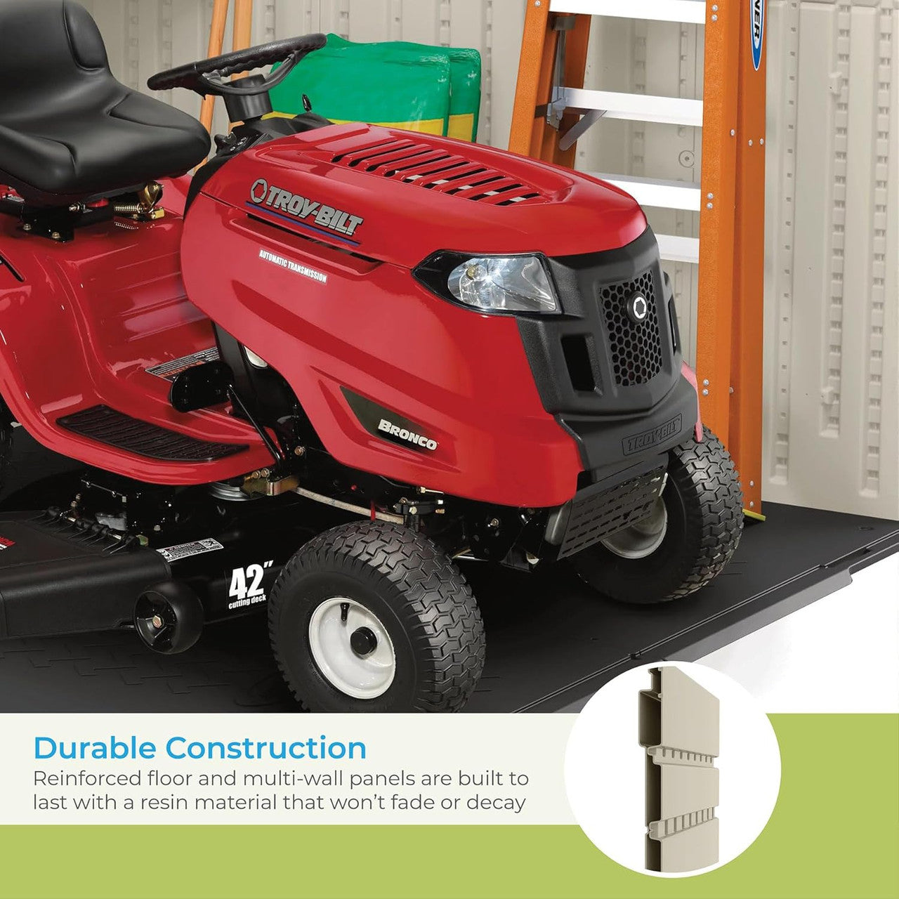 Constructed from durable multi-walled polypropylene resin panels, it ensures long-lasting strength and stability, standing up to harsh weather conditions and daily use. The reinforced heavy-duty floor is designed to support heavy equipment such as lawnmowers, tractors, and large tools, offering exceptional durability. With dimensions of 100.5 inches deep, 85.75 inches wide, and 103 inches high, this shed maximizes outdoor storage space while maintaining a sleek and functional design.With 378 cu. ft. of storage capacity, the Tremont® 8 ft. x 7 ft. Storage Shed by Suncast® has ample space for storing all of your lawn and outdoor equipment.