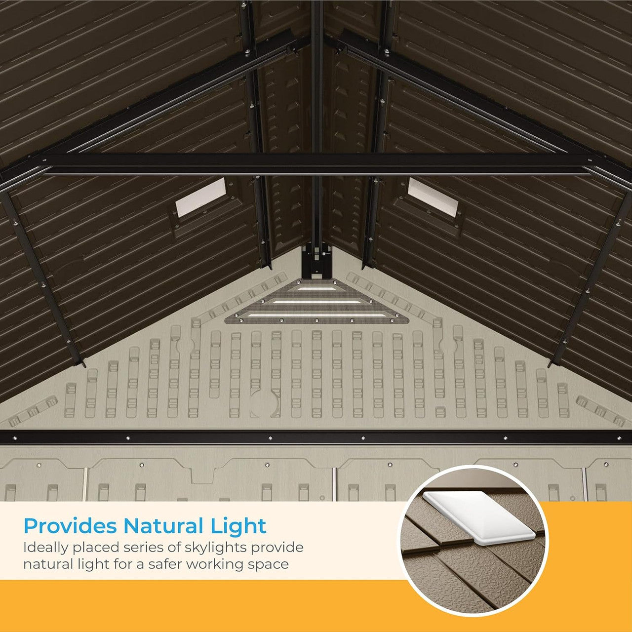 The reinforced resin floor is built to withstand heavy loads, including tractors, mowers and other lawn or outdoor equipment. In addition, utilize every inch of space with the included standard corner shelves. Four skylights along with large door windows provide natural light while you work. Sturdy double doors allow you to access your items easily, and is equipped with pad-lockable metal handles for added security (lock not included). Constructed of metal reinforced, multi-wall resin panels, this attractive shed can withstand the elements while looking great in your yard all year long.