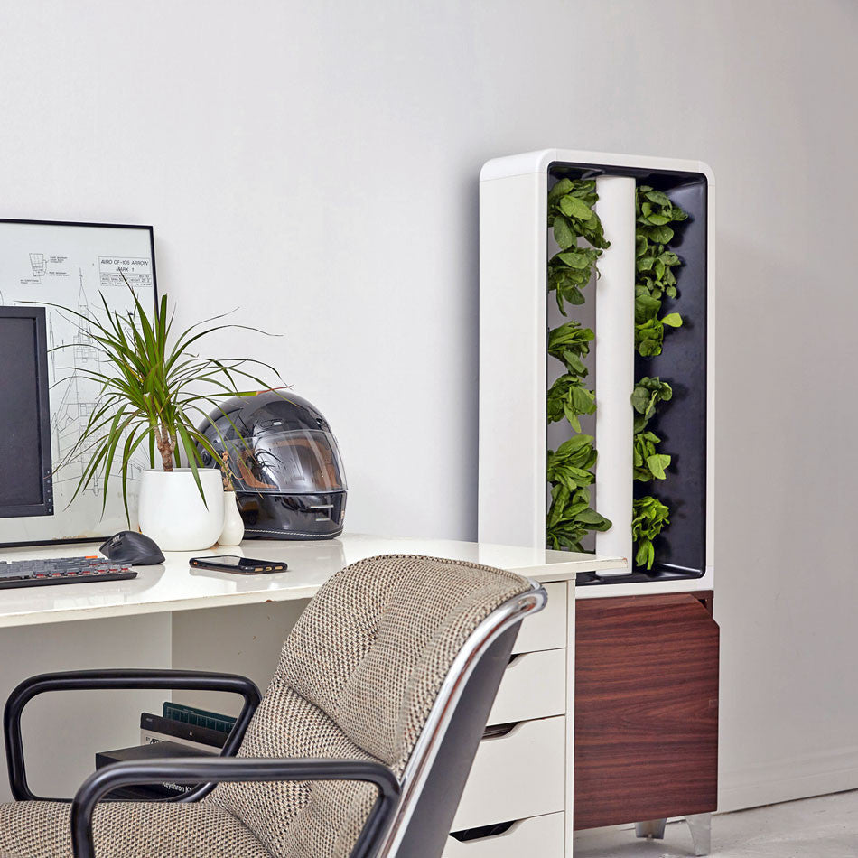 Bring your garden home with the Eve, a beautiful piece of furniture that allows you to grow up to 12 plants at once in a vertical hydroponic tower. Hydroponic garden systems allow you to grow without soil, utilizing liquid mineral nutrient solutions in the water reservoir.