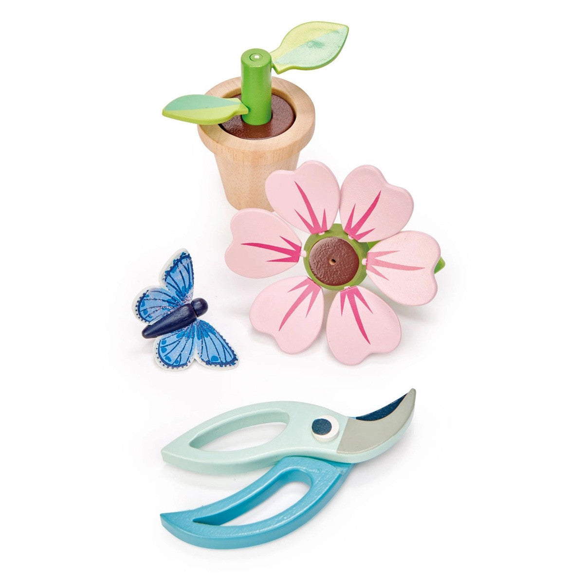 This set includes a solid wooden flowerpot, soil disc, stem, leaves and petals of a flower, a butterfly and shears.