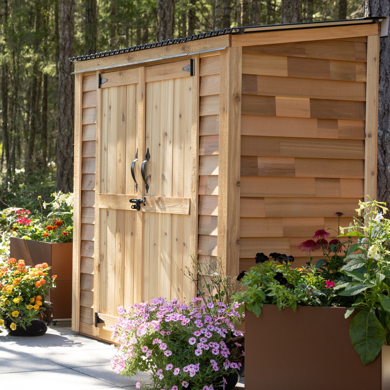 Made from durable, rot-resistant cedar, this 6' x 3' garden shed is an outdoor storage solution for storing garden tools, sporting equipment, evan a garbage can or two.