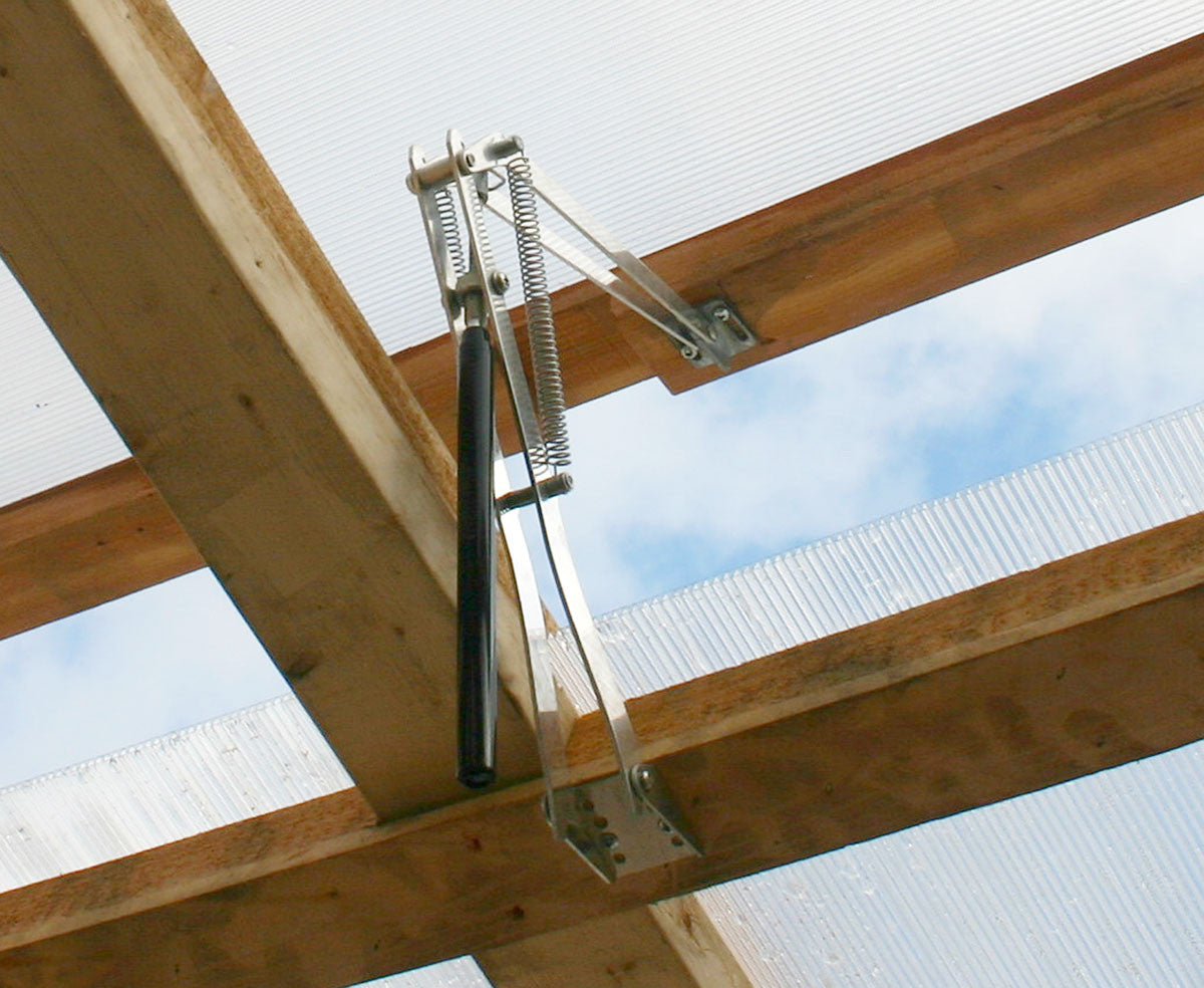 The cedar greenhouse kit includes 1 large vent window with a Univent automatic window opener. The window opens and closes automatically at approximately 70 degrees Fahrenheit creating an ideal growing environment.