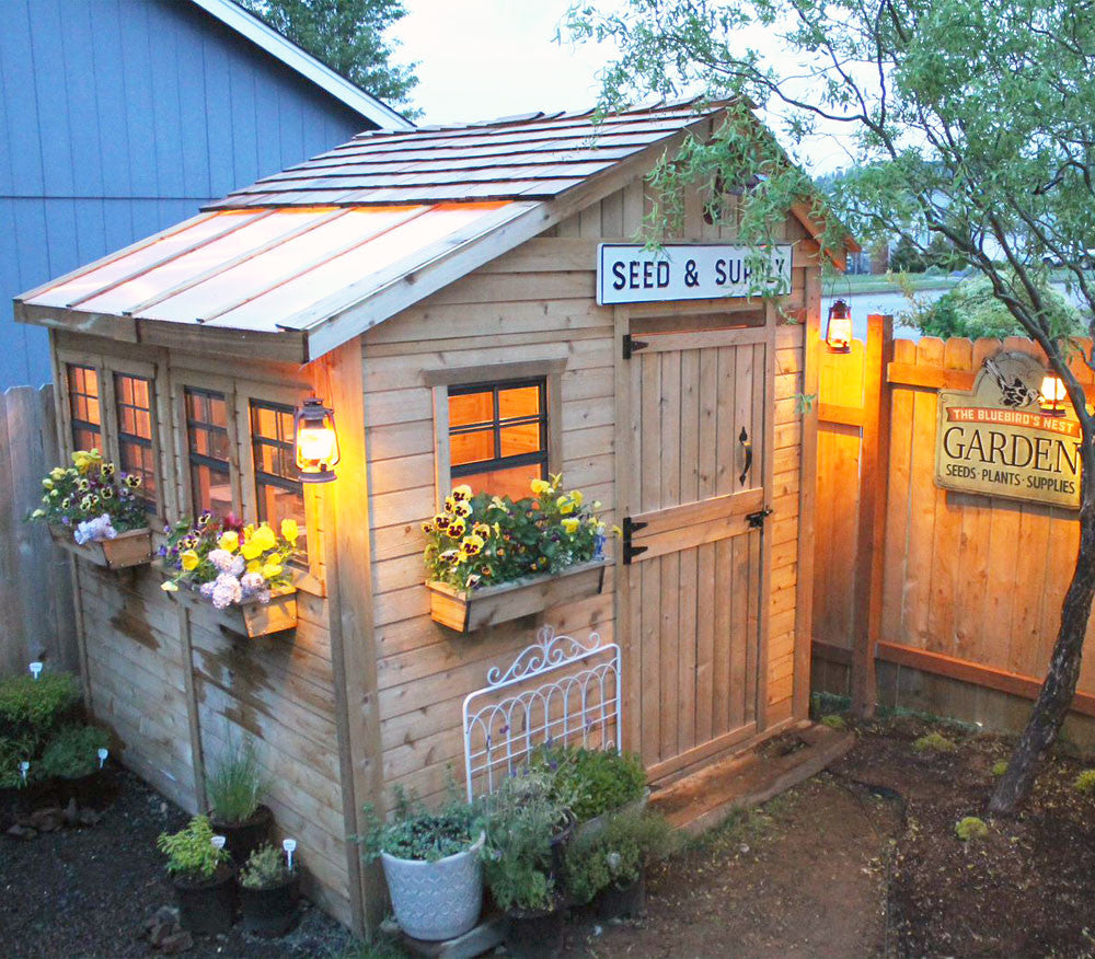 Measuring 8 feet by 8 feet, the shed has space to store tools and gardening supplies, and a workbench to hold your plants or work on other backyard projects.