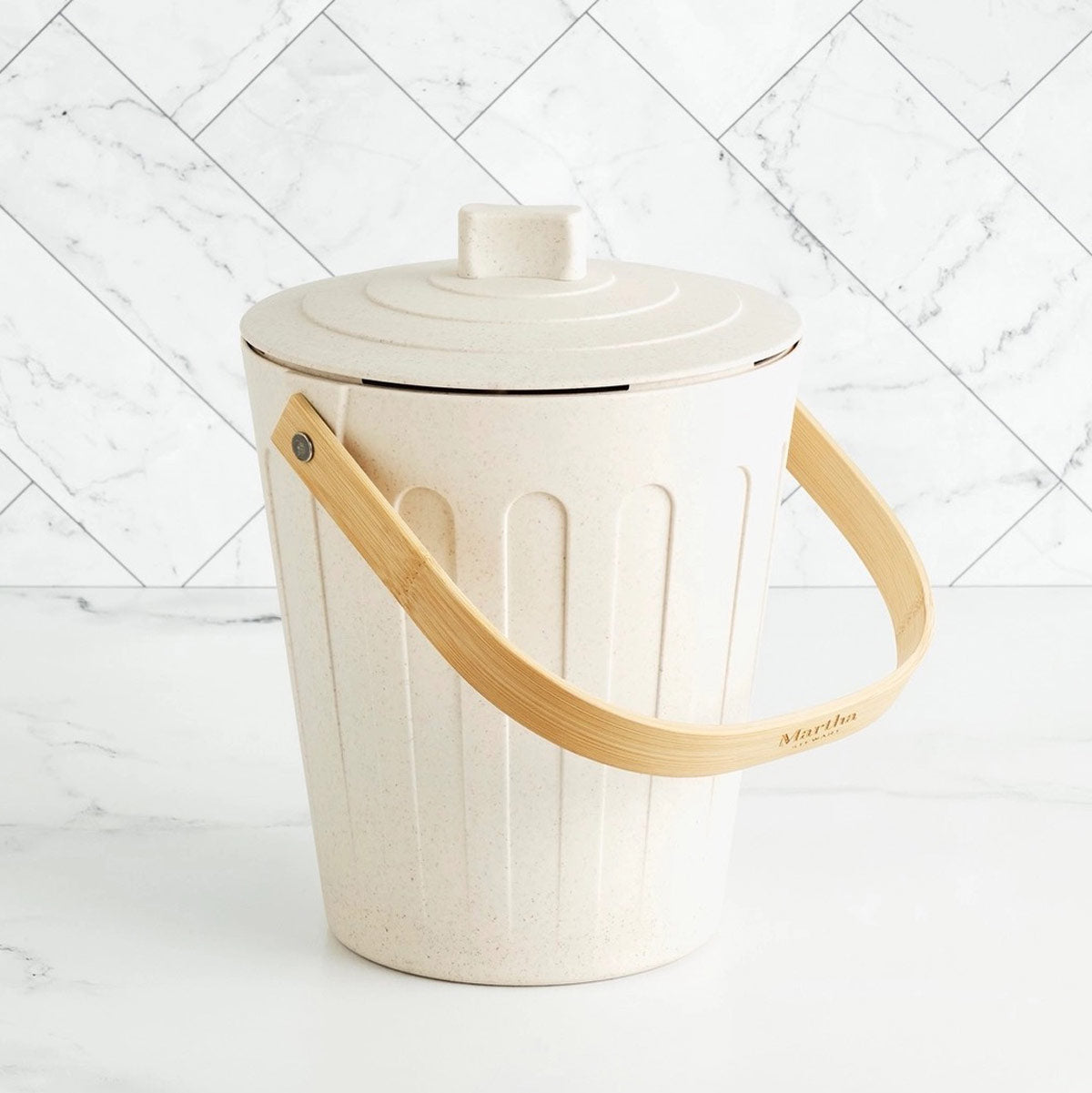 The compact size fits easily on countertops, and the ventilated, filtered lid helps block odors. The bin is dishwasher and microwave safe, free from chemicals and additives, and easy to clean.