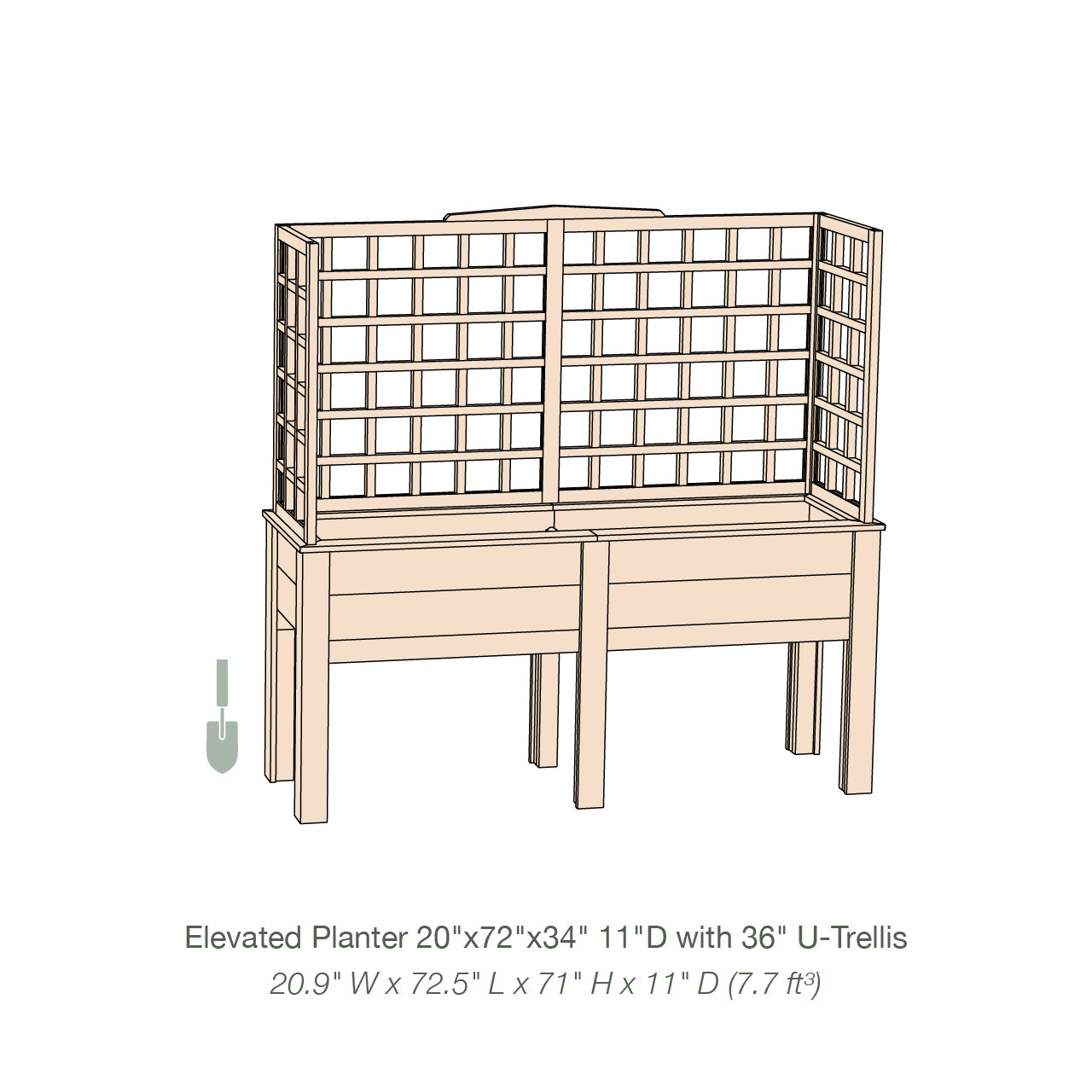 Choose your planter width, length and depth to suit your space and needs. The trellis portion is 36 inches tall, and the planter and trellis together measure 70 inches tall.