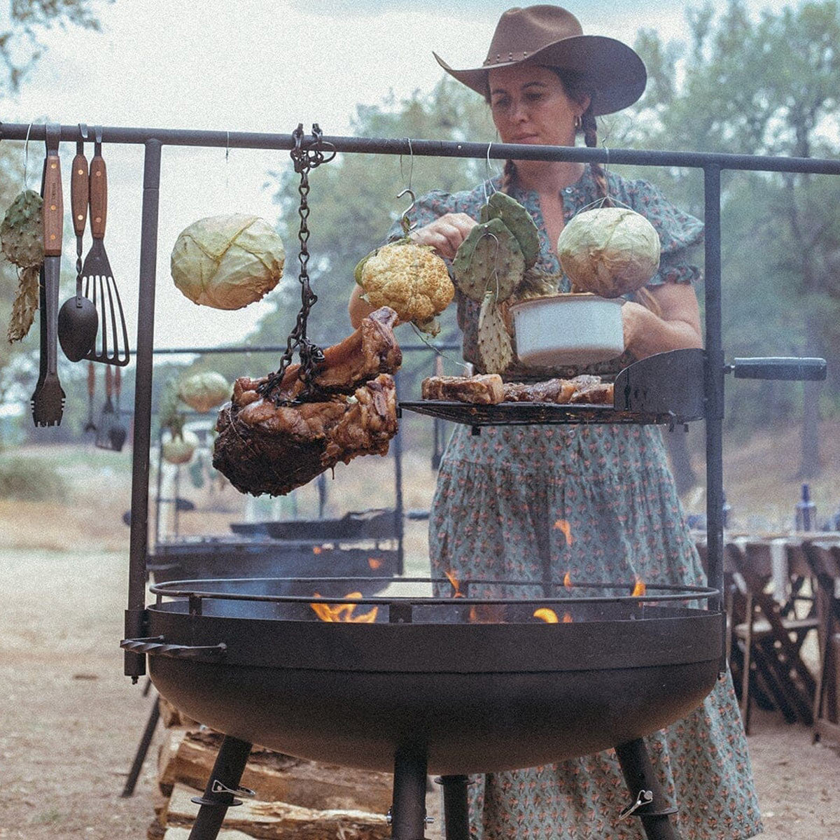 Inspired by the open fire cooking of the American West, this backyard must-have can be a simple fire pit or an outdoor cooking game changer.